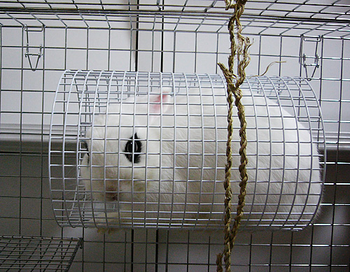 掃除機をかけたら、ドリィがおびえて空中ハウスに避難していました。