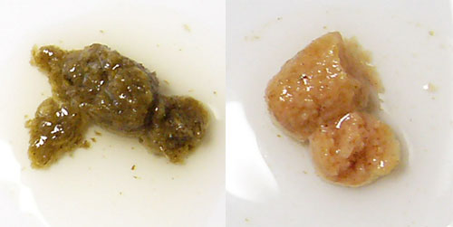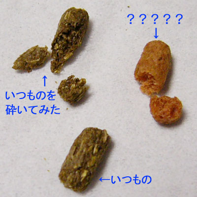 ・・・このふたつのペレットが違うモノであるということは、このふやけ方を見ても明白ですね。