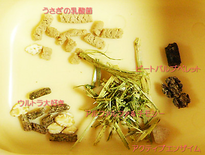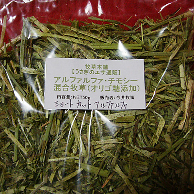 短くカットされたアルファルファに、チモシーとオリゴ糖が混ぜてあるそうです。