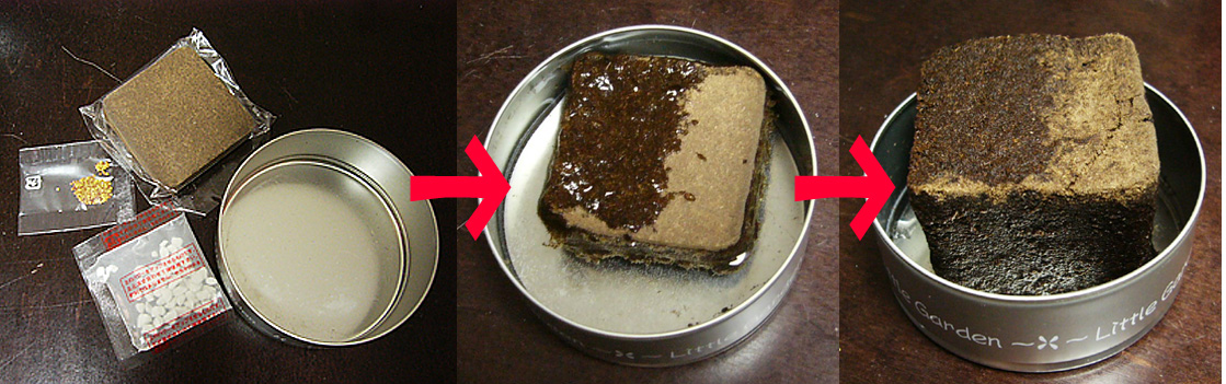 キューブ状の土を缶に入れ、ぬるま湯を缶の8分目くらいまで入れます。