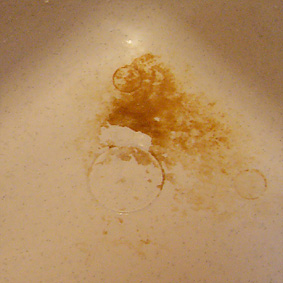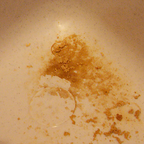 カスカスは簡単に流れ落ちましたが、こびりついてしまった汚れはこすっても石けんをつけても落ちません。