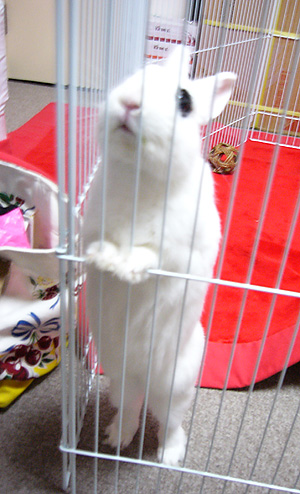 サークル活動のときにお野菜をあげるのですが、それを食べてしばらくすると、サークルのフェンスをカジカジしたり、カーペットをホリホリしたり、写真のようにフェンスに手をかけて立ち上がったりします。