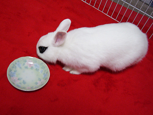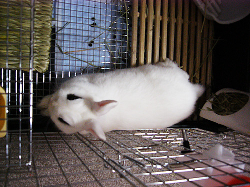 ケージの中はやっぱり退屈なのか、寝る・水を飲む・牧草を食べるくらいしかすることがなさそう。